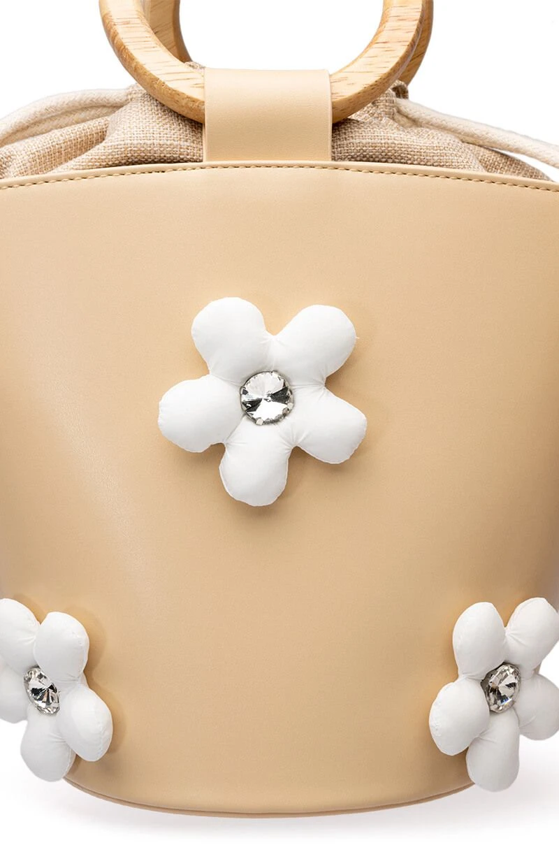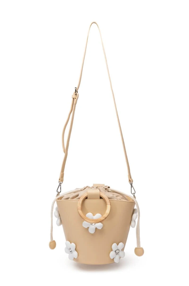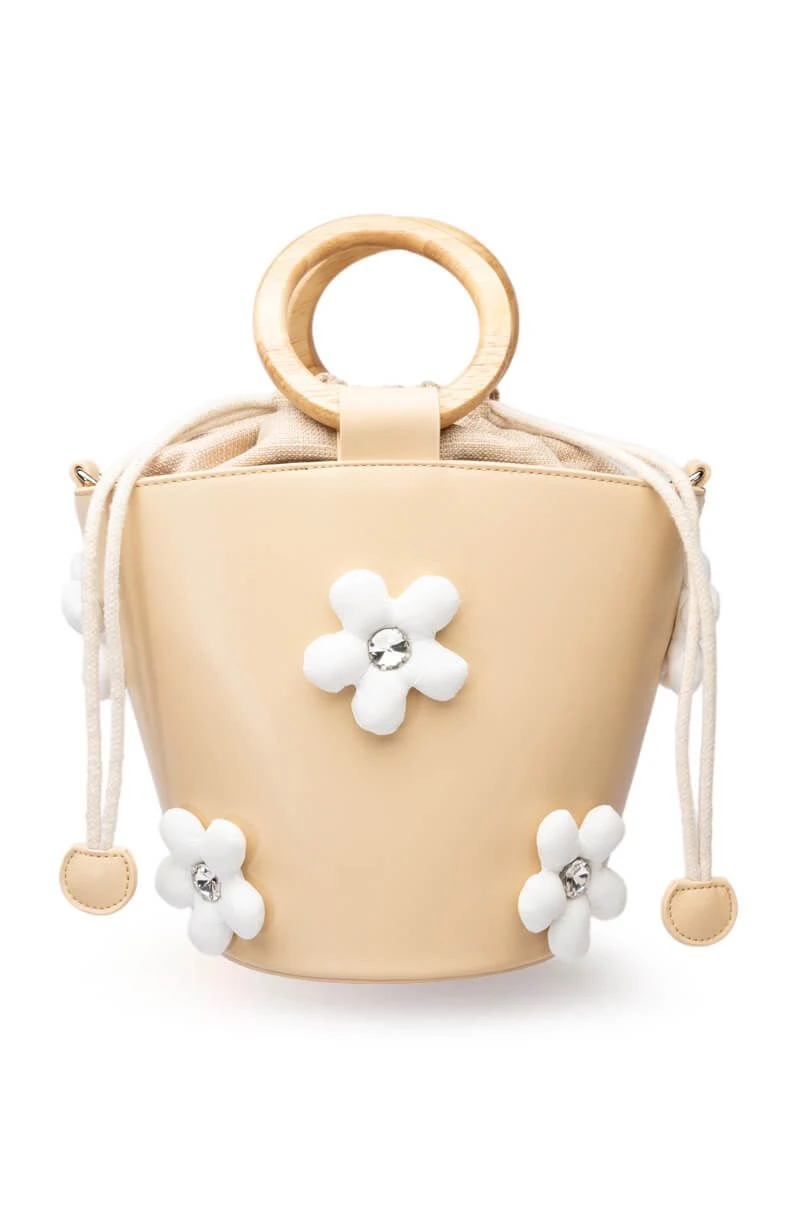 The AKIRA Label Regal Floral Detail Buck Bag features a structured vegan leather fabrication, a bucket bag silhouette, an inner raffia lining, dual faux wooden handles, and a drawstring top closure. Complete with an adjustable, removable shoulder strap, puffy three-dimensional floral accents, rhinestone detailing, and a roomy interior pocket.
