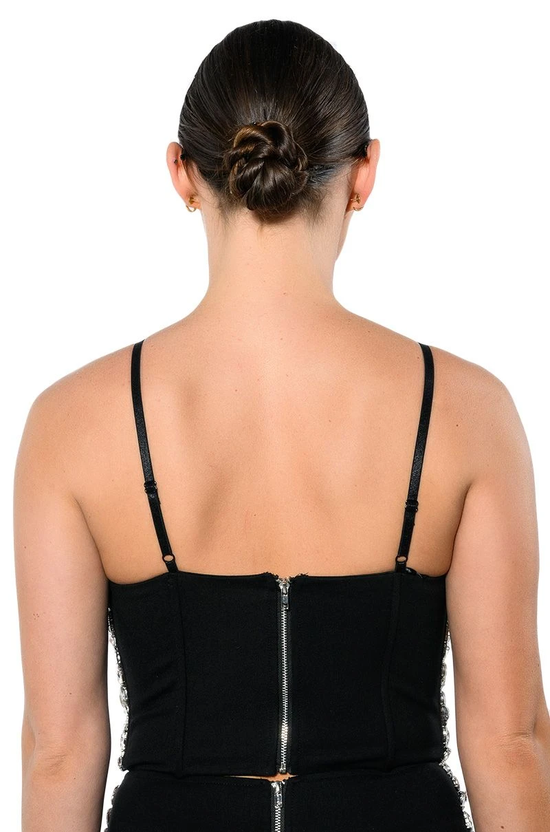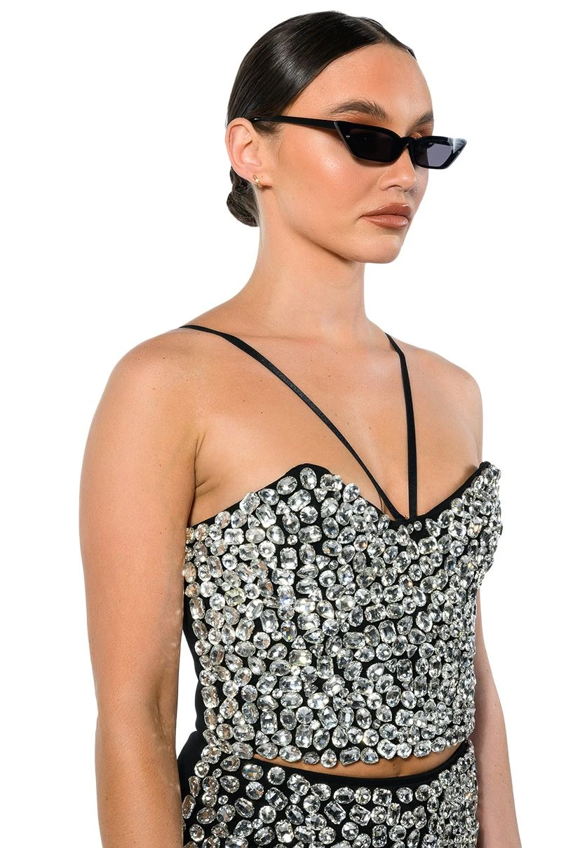 The AKIRA Label Rich With Jewels Crop Tank Top is a glimmering cropped tank featuring a smooth knit fabrication, heavily embellished rhinestone detailing throughout, a v neckline, and a cropped cut. Complete with adjustable tank straps extending from the neckline and an exposed back zipper closure.