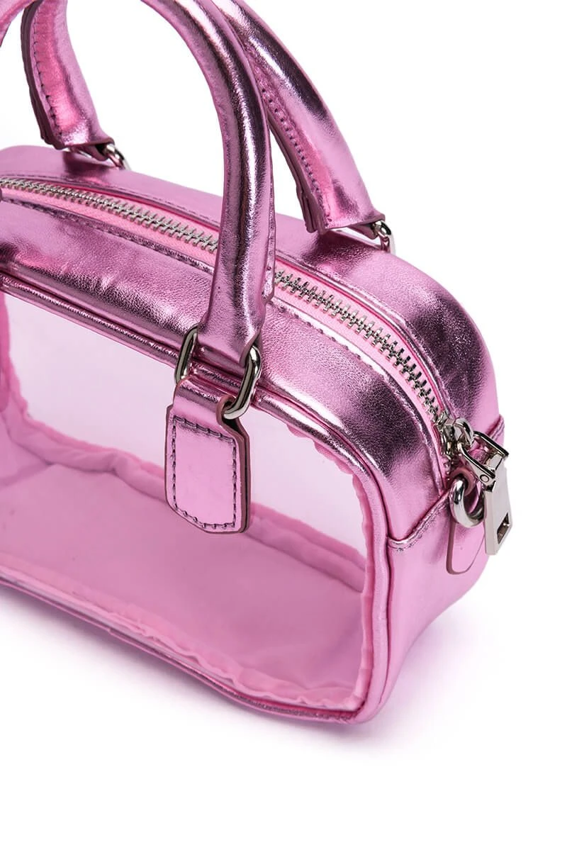 The AKIRA Label Right Through Me PVC Purse is made from a metallic faux leather base fabrication and features a PVC front and back panel, a small, boxy silhouette, two metallic faux leather top handles, a roomy inner compartment, and a detachable metallic silver curb chain link shoulder strap. Complete with a top zipper closure.