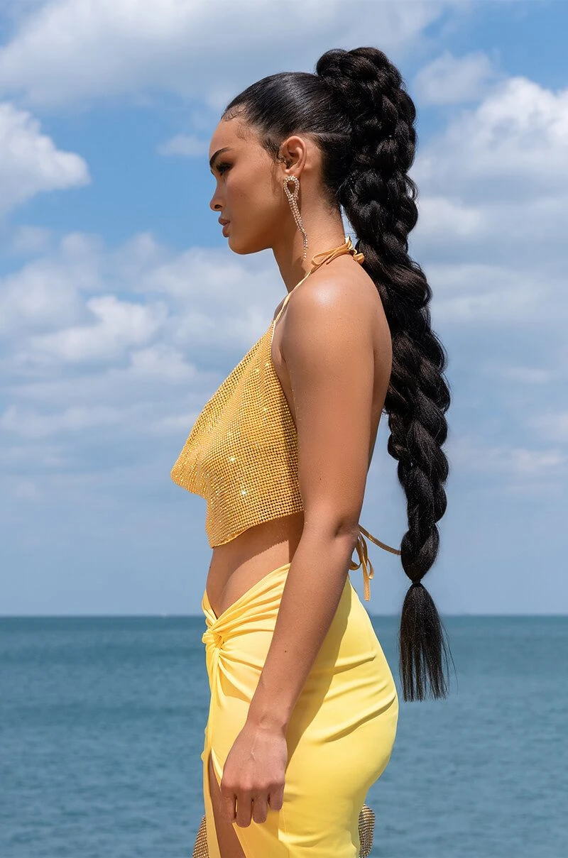Shout out to the bad gal! Live your Carribean queen dreams in The AKIRA Label Riri Cowl Neck Rhinestone Bralette. This sparkling rhinestone mesh piece features a satin inner lining, a tie back halter design, a cowl neckline, and a tie back waist with open back. Complete with a cropped cut. Pair this piece with leather pants for your next festival look!