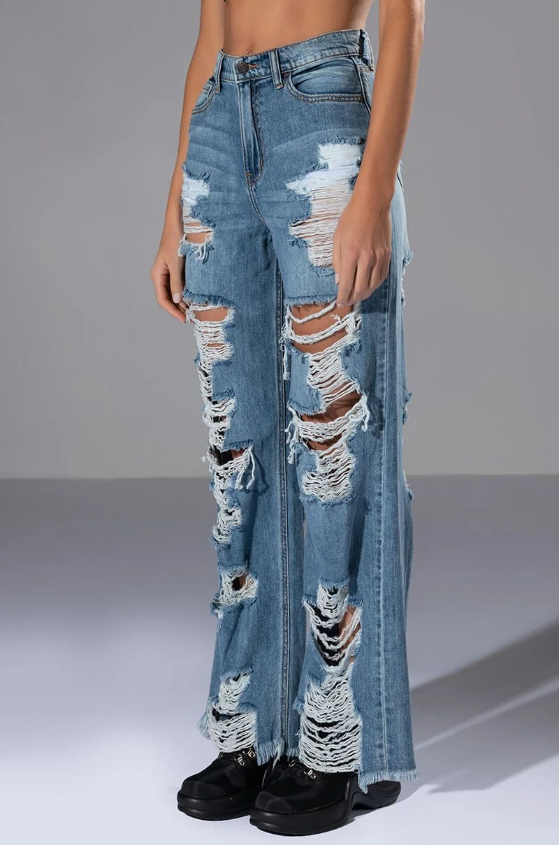 The AKIRA Label Rock N’ Roll Destroyed Relaxed Jeans are a structured denim pant complete with distressed rips down the front and back, wide leg raw hems, front and back pockets, and a high rise waistband. Style these with your favorite crop top and square toe boots for a casual trendy look!