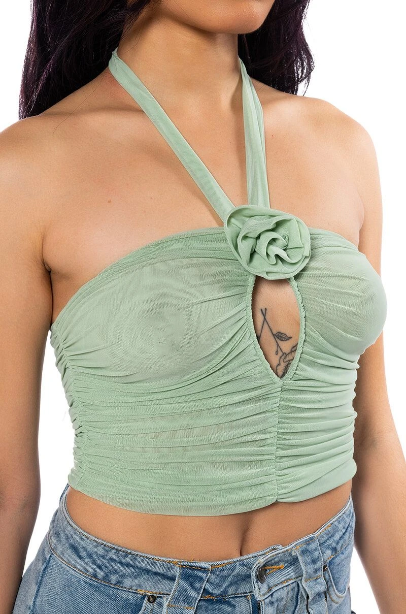 The AKIRA Label Sadie Sage Green Keyhole Halter Top is a chic and sassy number made from a stretchy, mesh base fabrication and features a self-tie halter neck, a floral applique at the center, keyhole cutout, sleeveless silhouette, and sexy ruched sides. Complete with an inner mesh lining, ruching at the back, and a slip-on fit. Style with wide leg jeans, a leather bomber jacket, and platform clogs for an effortless, that-girl look.