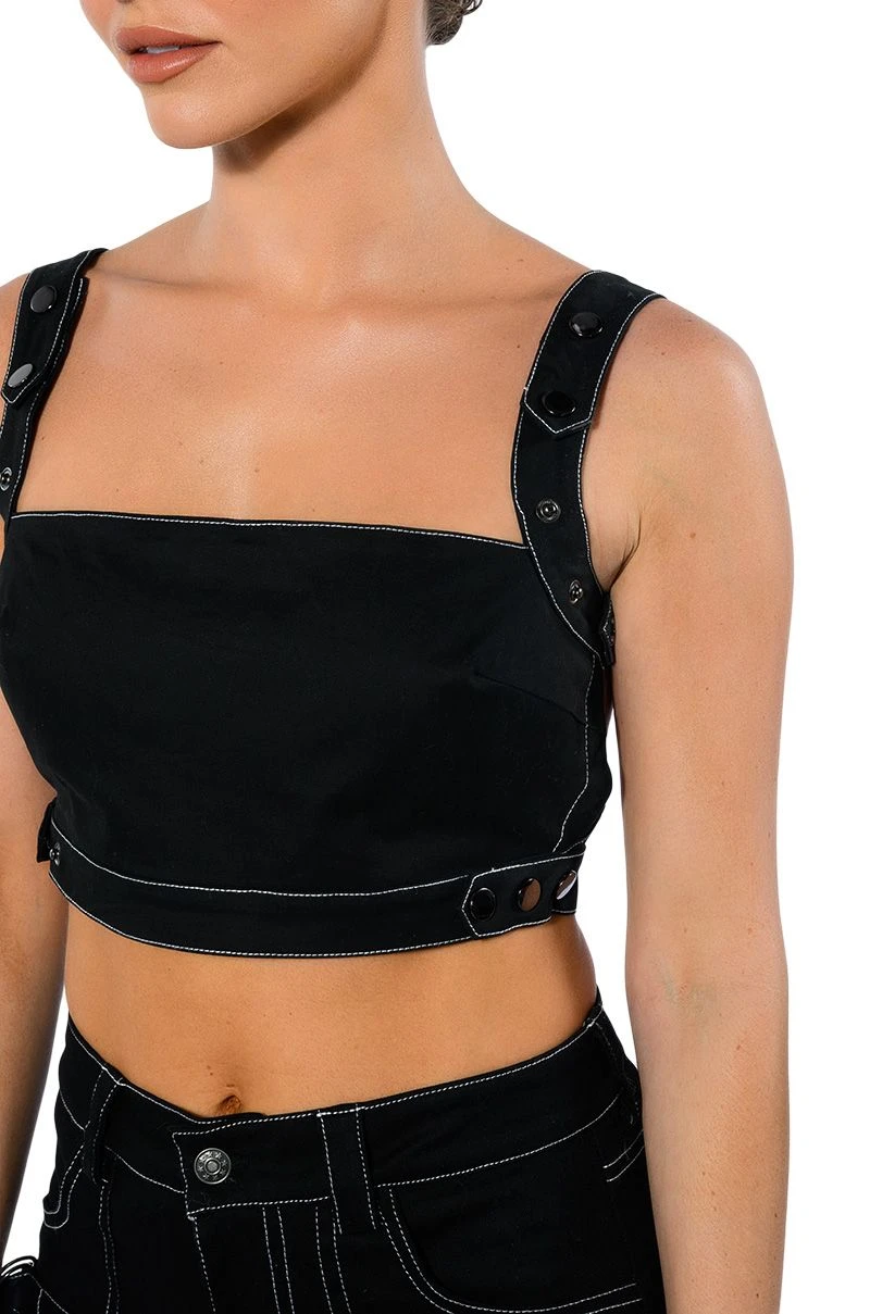 The AKIRA LabelSecret Admirer Denim Crop Top features a structured denim fabrication, adjustable snap button tank straps, an ultra-cropped silhouette, and a backless design. Complete with snap button closures on each side. Pair this piece with the coordinating AKIRA Label Secret Admirer Denim Maxi Skirt for a fierce look!