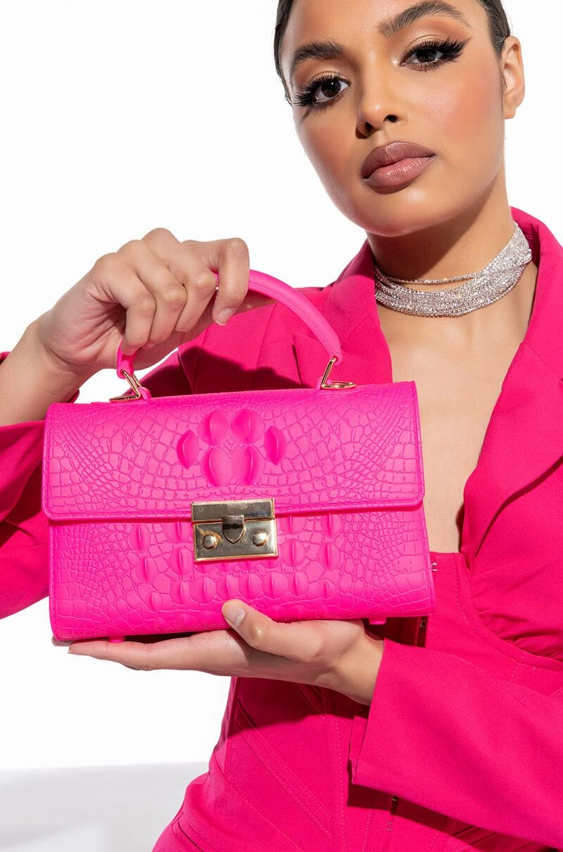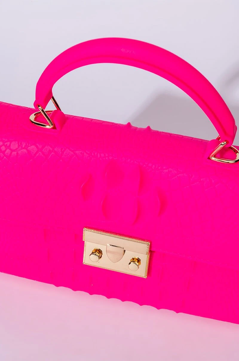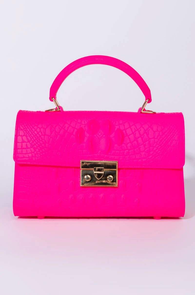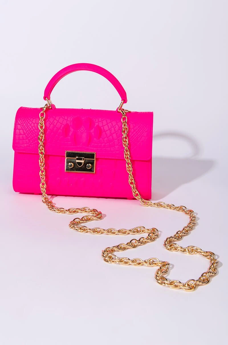 In a while, crocodile! The AKIRA Label See Ya Later Alligator Large Med Fuchsia Bag is made from a rubberized crocodile fabrication and is complete with a top handle silhouette, a long, detachable gold chain strap, and a push lock closure.