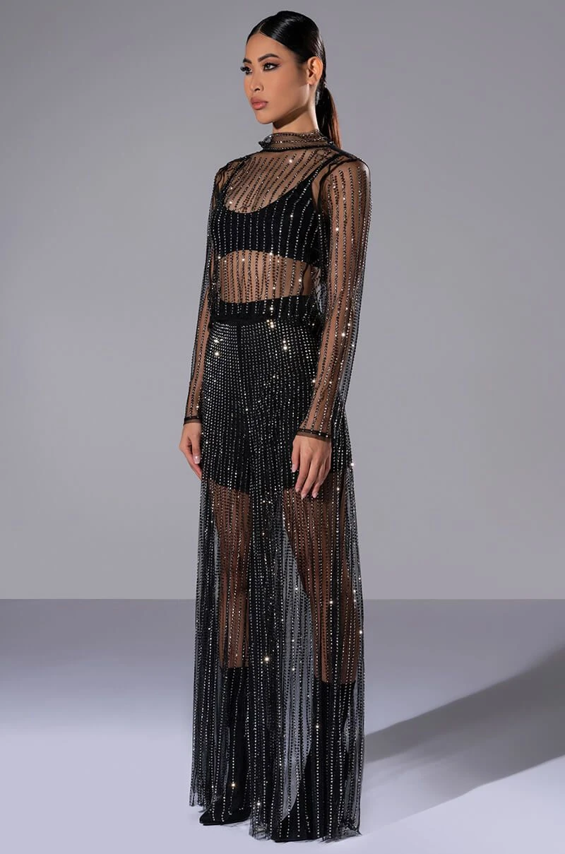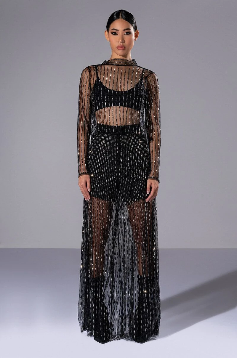 We’re in LOVE with The AKIRA Label Glam Night Out Mesh Wide Leg Pants! These bottoms are made from a sheer mesh fabrication and feature all over shiny striped rhinestone embellishments. Complete with a high waist rise, elastic waistband, built in