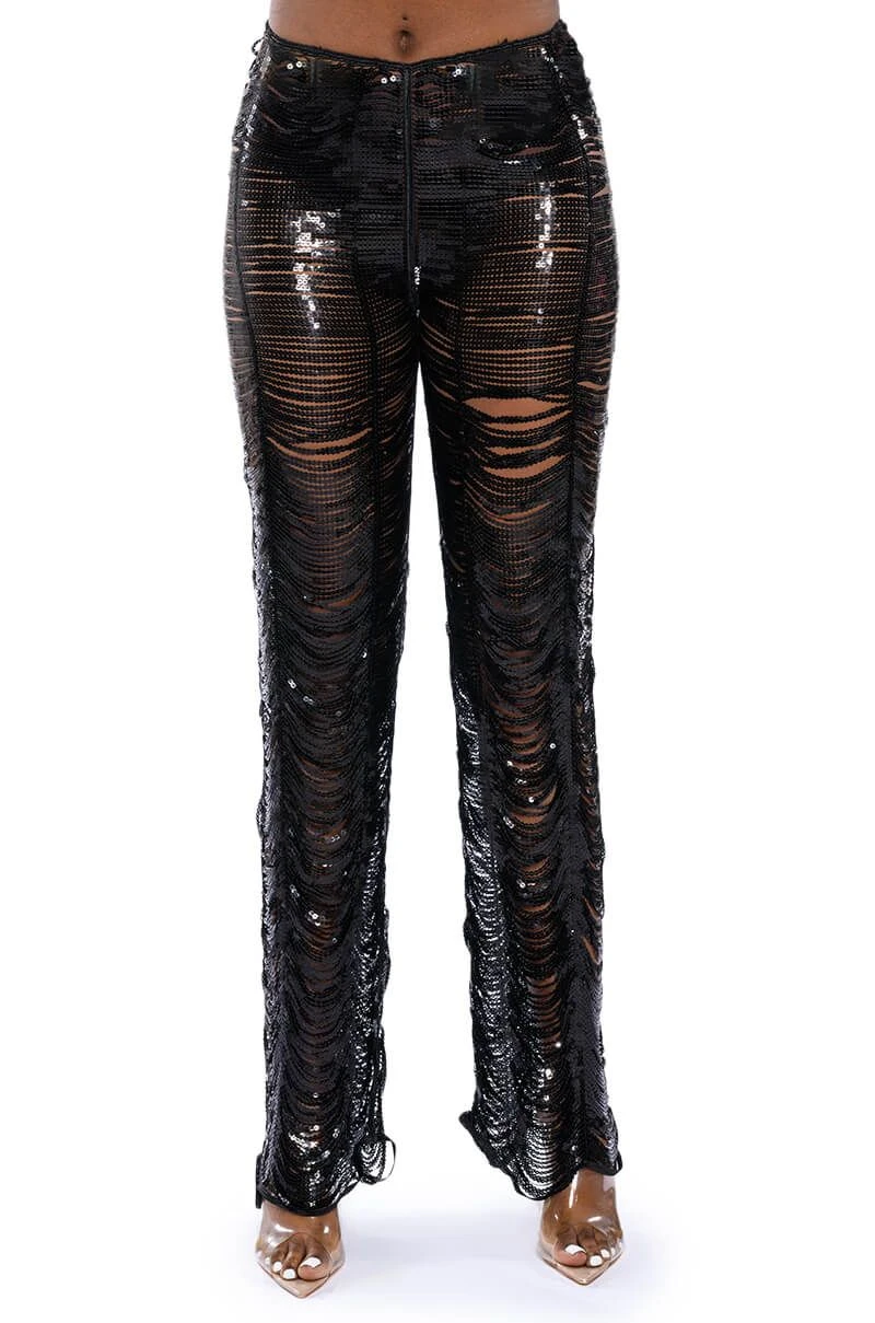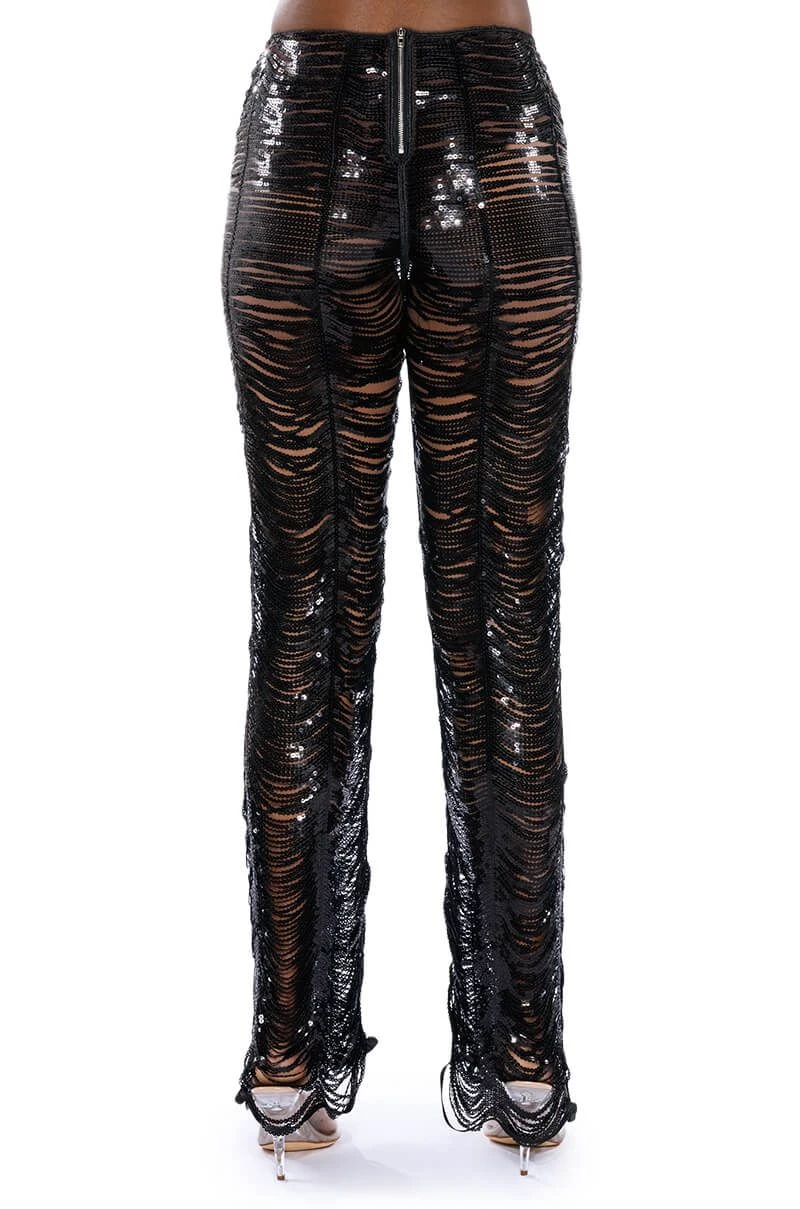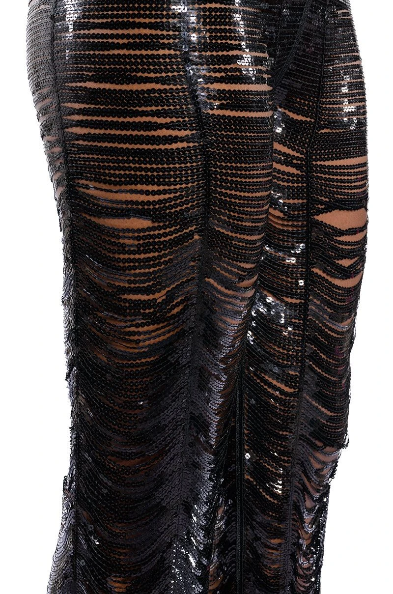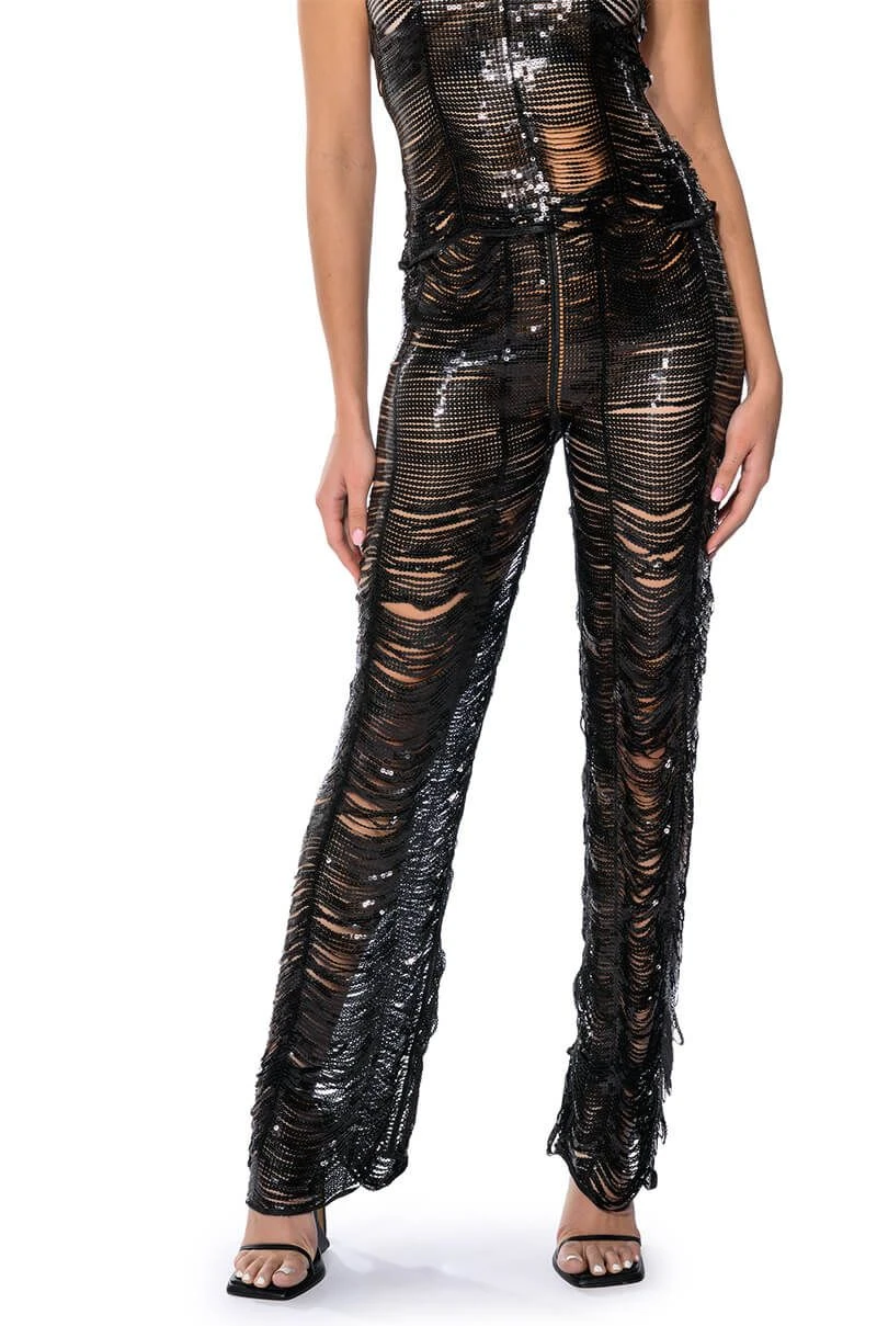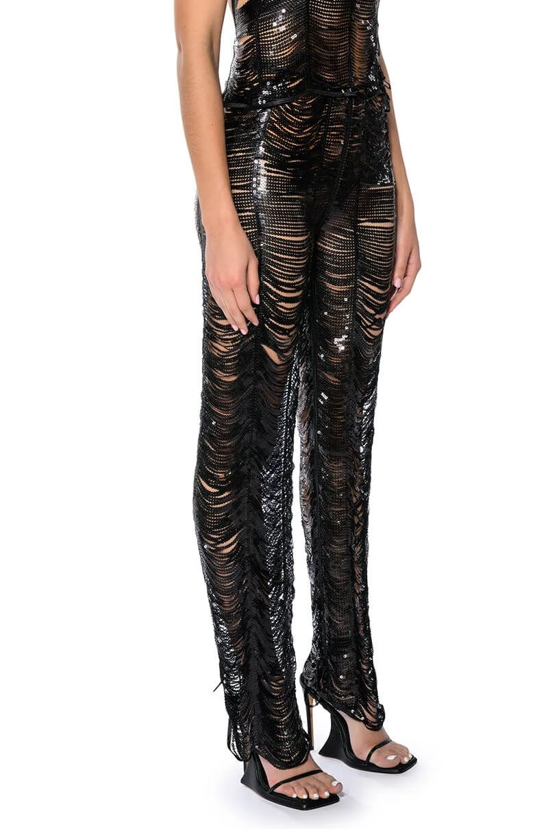 The AKIRA Label Senorita Embellished Straight Leg Pant In Black is made from an iridescent, unlined sequin link fabrication, featuring a high waisted silhouette, and a sexy, cascading sequin embellished design. Complete with a long straight leg design and a back zipper closure. Pair this piece with the coordinating AKIRA Label Senorita Embellished Halter Top and heels to complete the glam look.