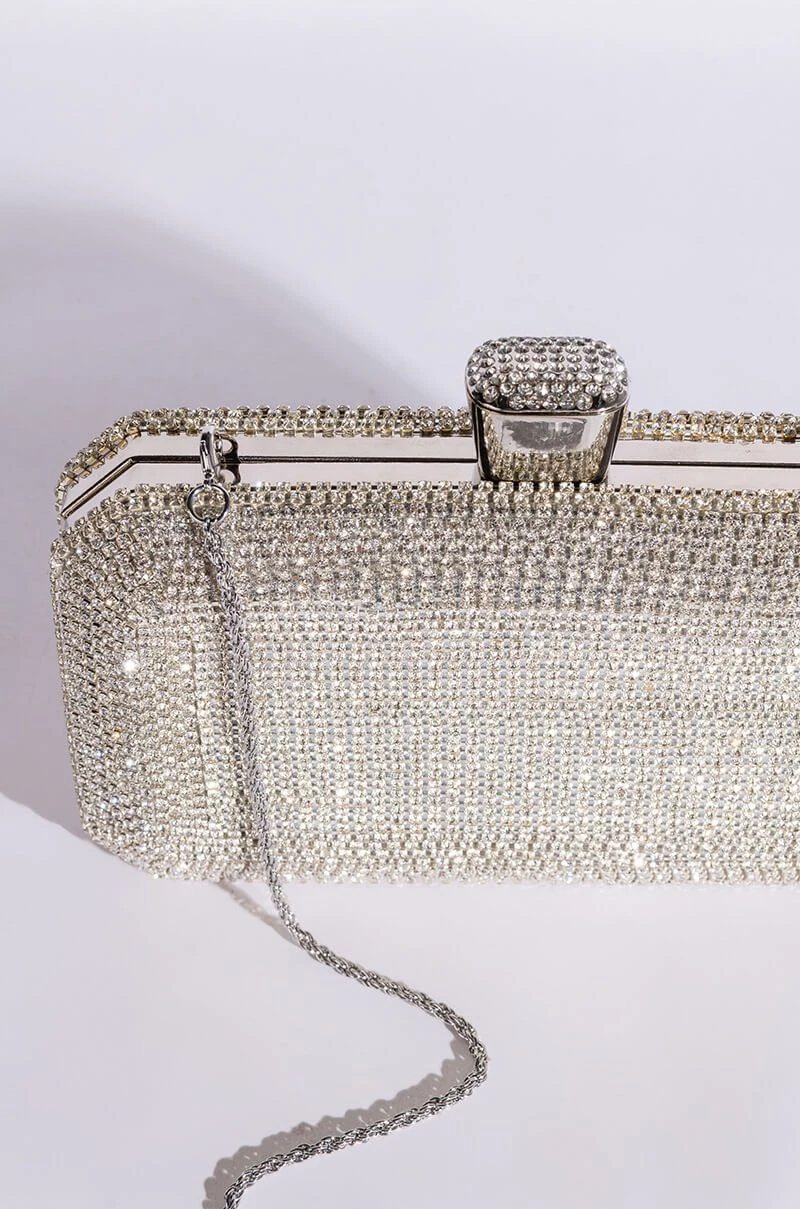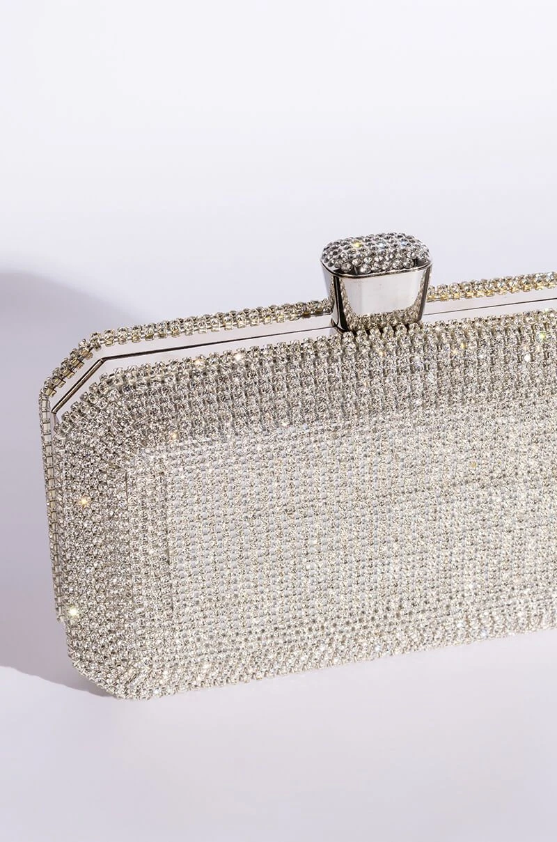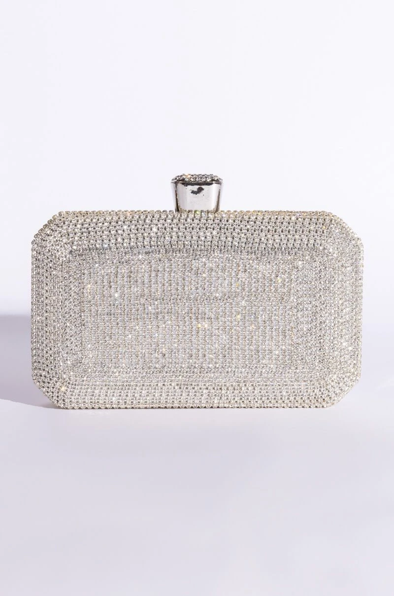 Catch the light in the AKIRA Label Shine On Me Diamond Clutch! This opulent clutch features an emerald-shaped motif, all-over rhinestone embellishments, a rhinestone-embellished top push lock clasp, a satiny inner pocket, and a removable braided chain link shoulder strap.