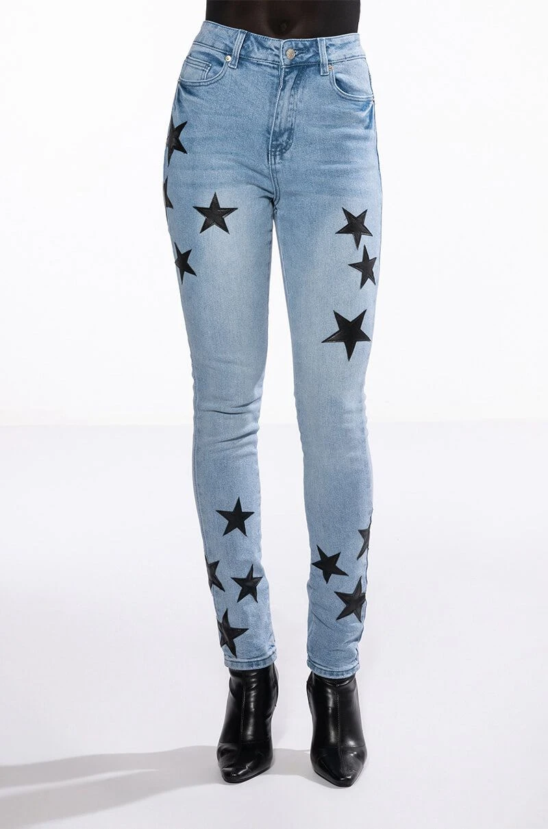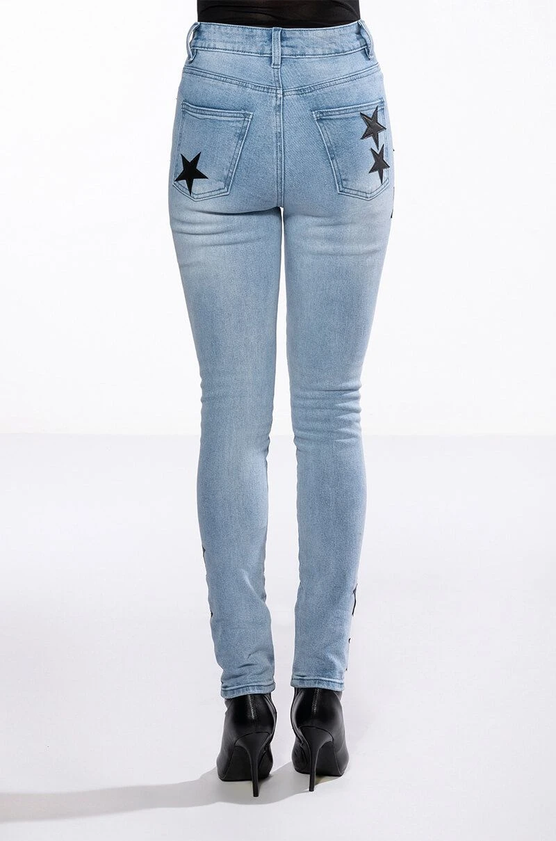 The AKIRA Label Shining Star Patch Detail High Rise Skinny Jean is made from a washed denim fabrication and features a high rise waist, working belt loops, a classic five-pocket design, whiskering on the upper thighs, stitched vegan leather star patch detailing, and a skinny leg silhouette. Complete with a button and zipper front closure.