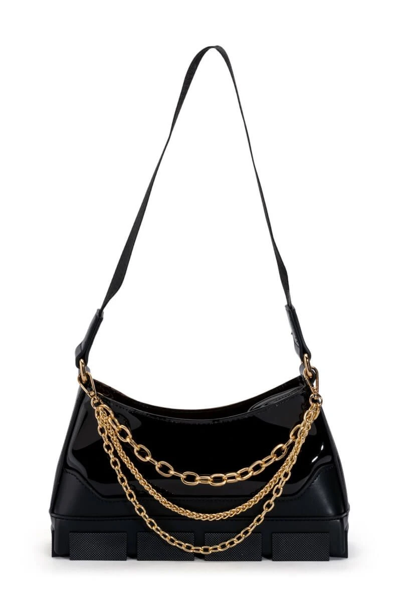 The AKIRA Label Street Fighter Rubber Bag in Black is made from a translucent PVC body, with a faux leather and rubber base. It features a detachable faux leather shoulder strap, mini purse silhouette, and detachable gold chain links. Complete with a top closure and woven textile strap handle.