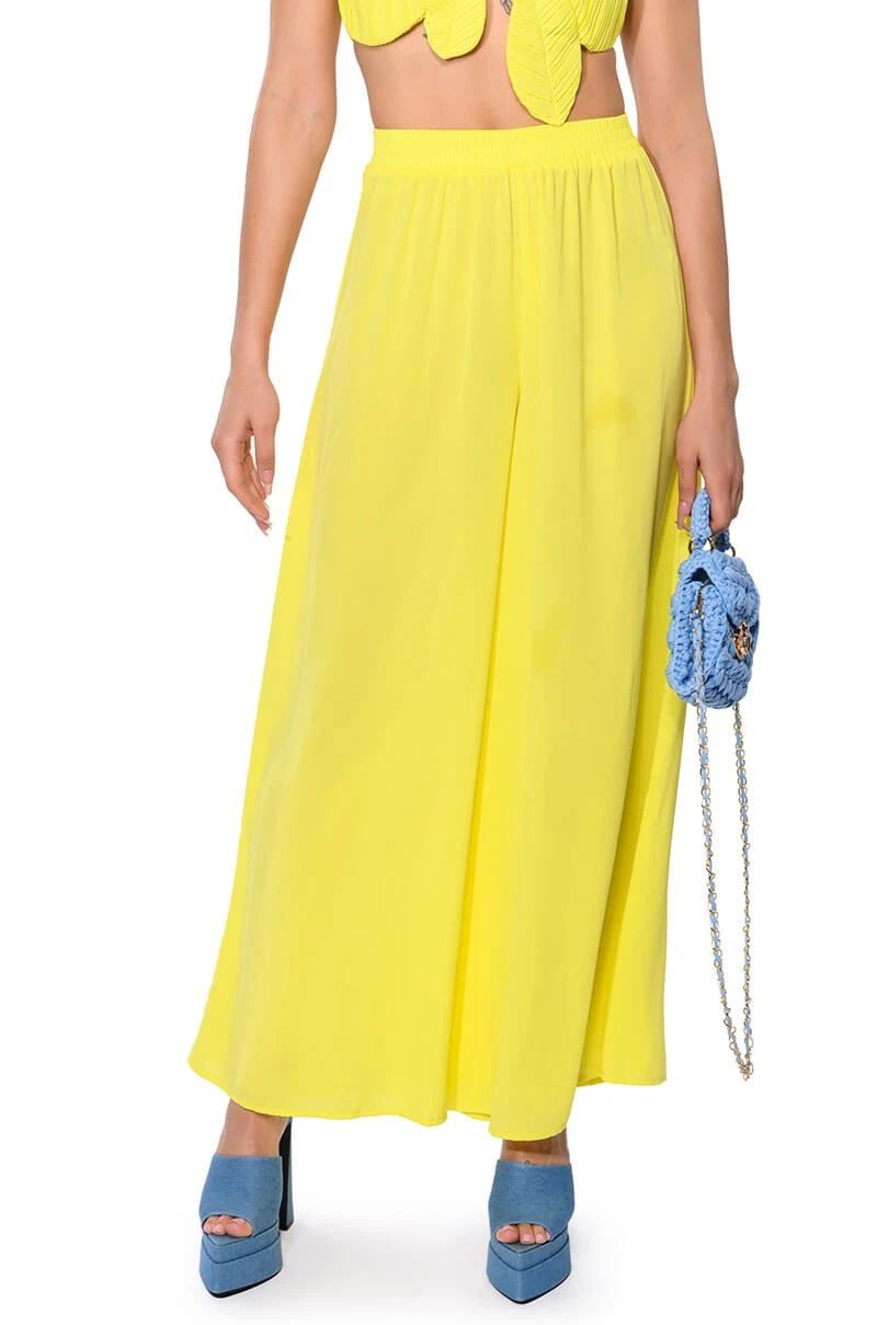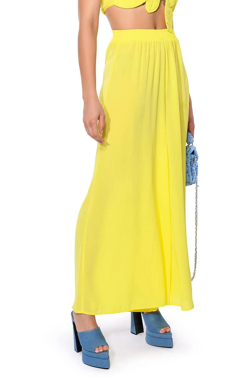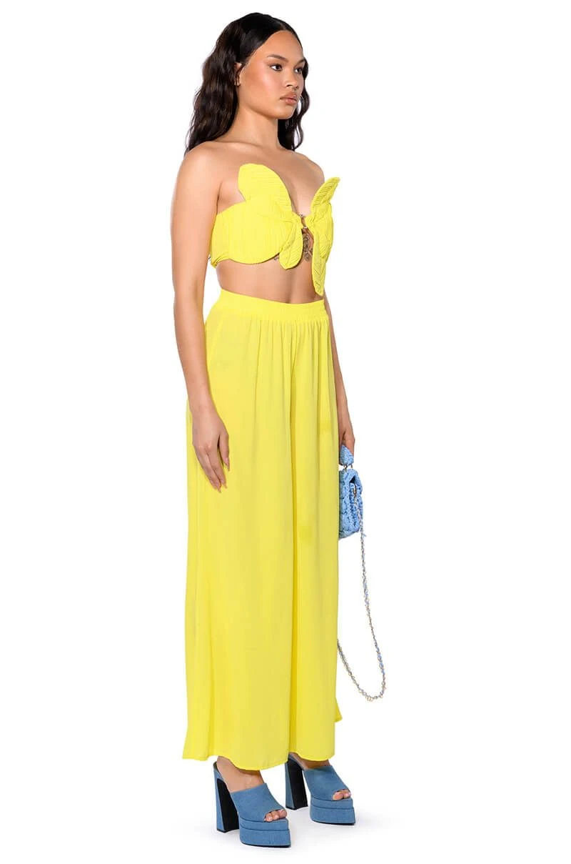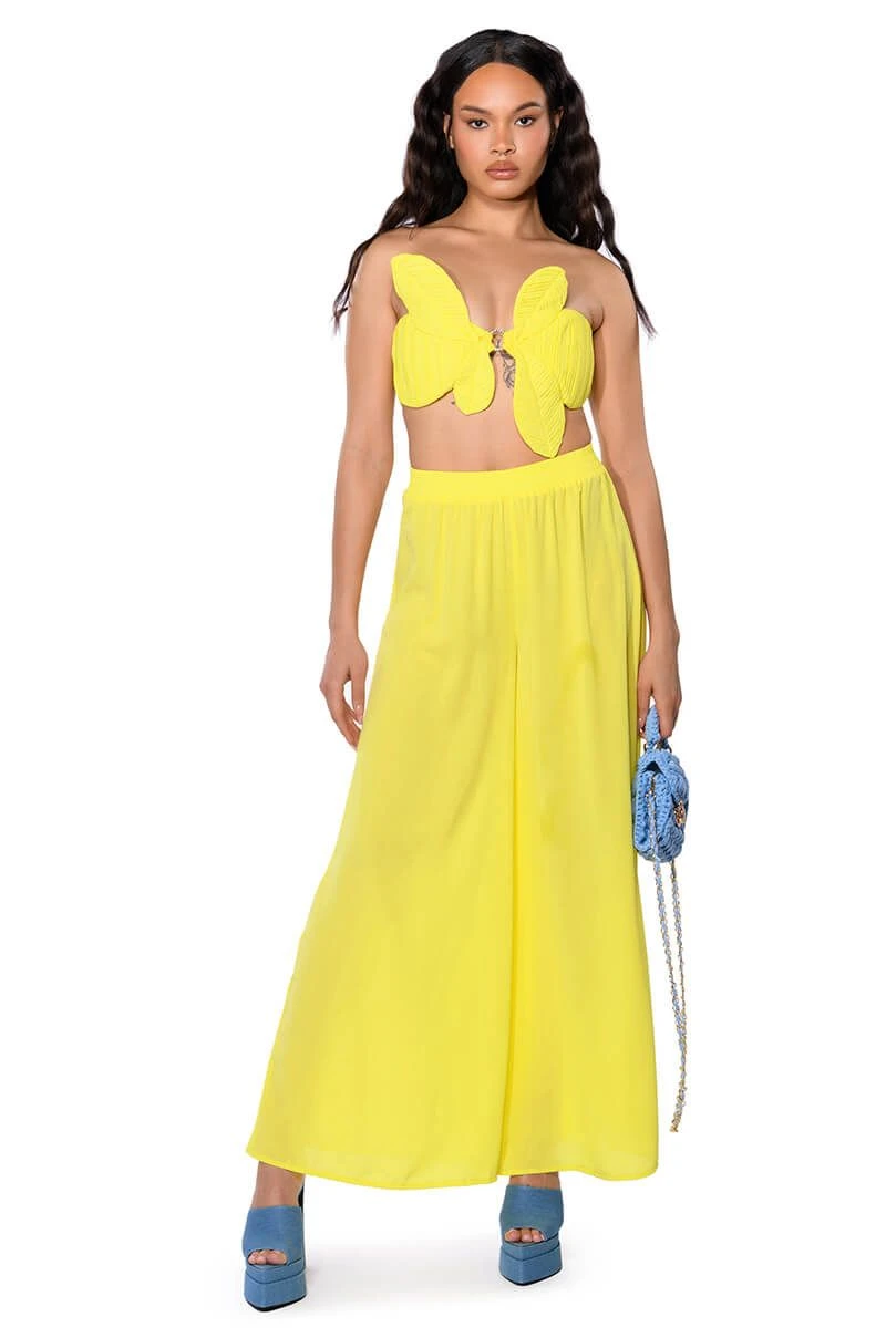 Shine on in The AKIRA Label Sunshine Baby Wide Leg Palazzo Pant! This vibrant piece is made from a sheer, lightweight fabrication and features a high rise waist, a shirred elastic waistband, a wide leg silhouette, and a pull-on fit. Pair these bottoms with the matching AKIRA Label Sunshine Baby Button Down Blouse and Sunshine Baby Strapless Crop Top to complete your look.