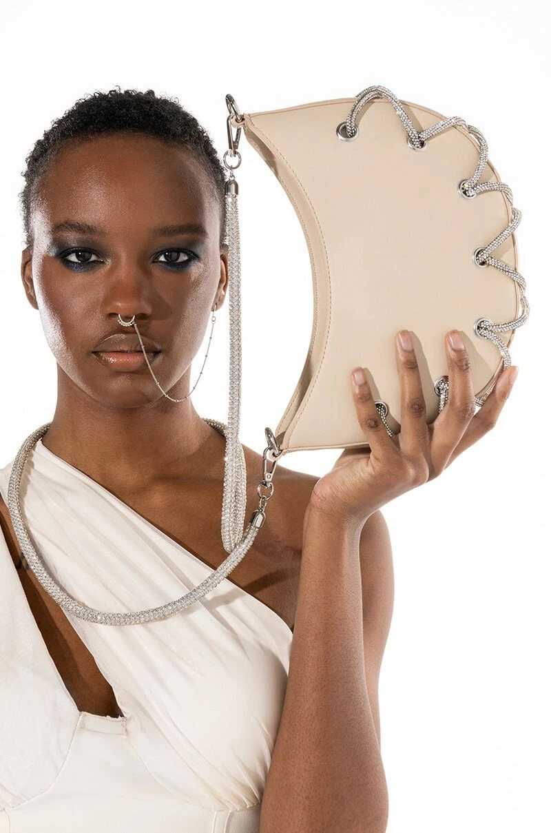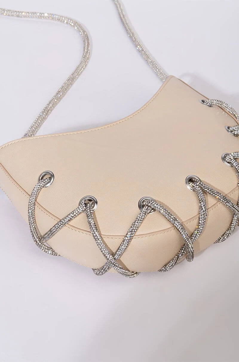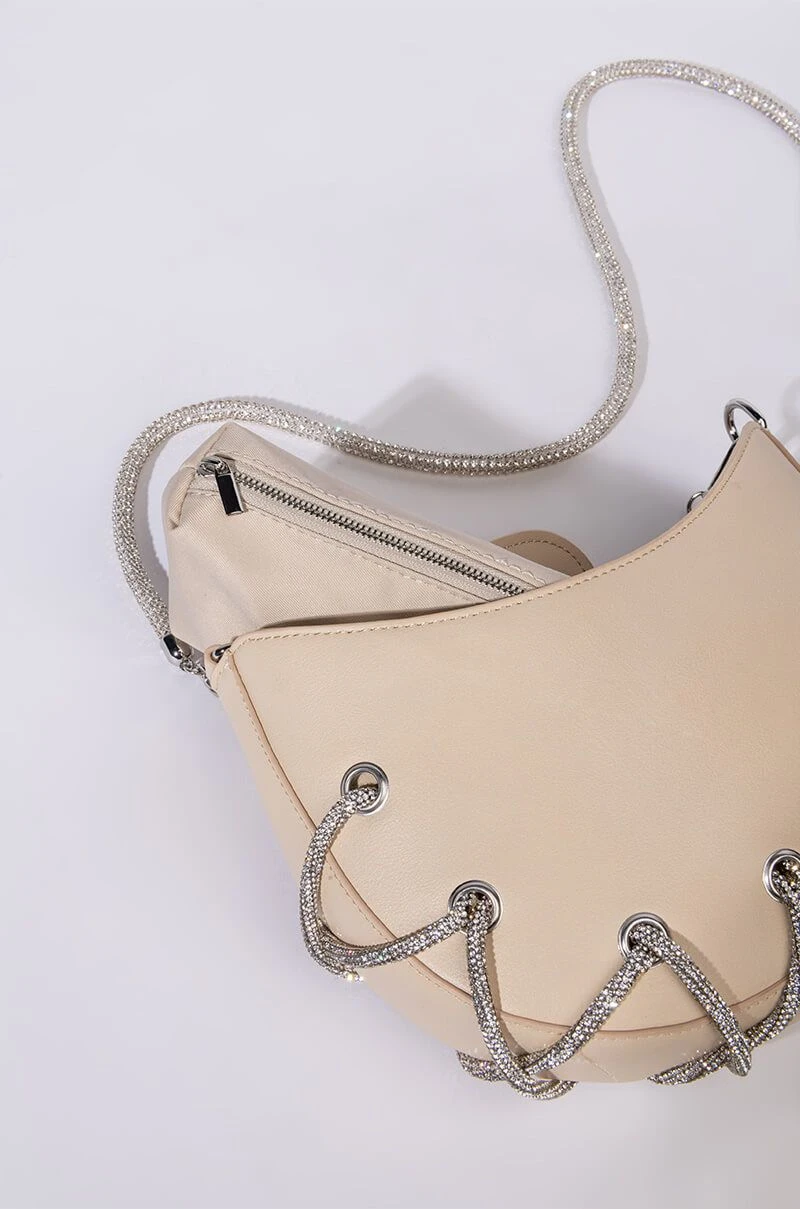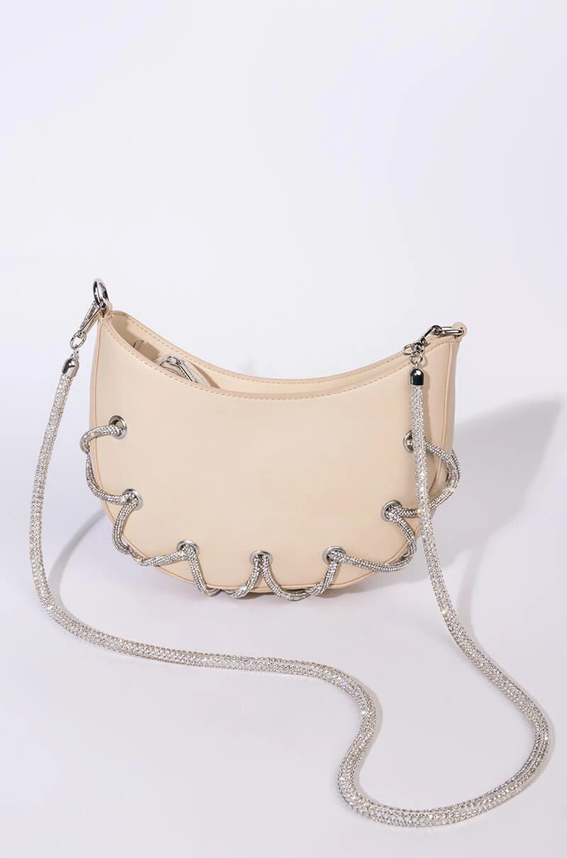 Sweet and chic! The AKIRA Label Sweetie Rhinestone Cord Purse features a vegan leather fabrication, a half moon baguette silhouette, a removable rhinestone cord shoulder strap, and woven rhinestone cord detailing through. Complete with a detachable zip top inner pouch and a magnetic fold over clasp closure.