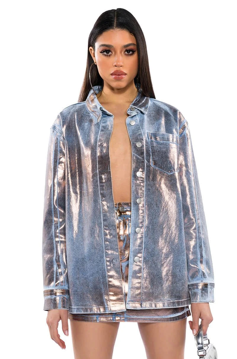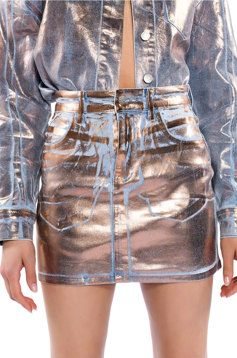 The AKIRA Label Teleport Foil Effect Denim Mini Skirt is made from a washed denim fabrication base and features metallic foil detailing, a high rise waist, working belt loops, slant side pockets, back pockets, a mini length silhouette, and a button and zipper front closure. Pair this piece with the coordinating AKIRA Label Teleport Foil Effect Denim Button Down to complete your look.
