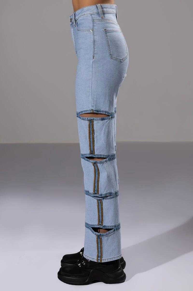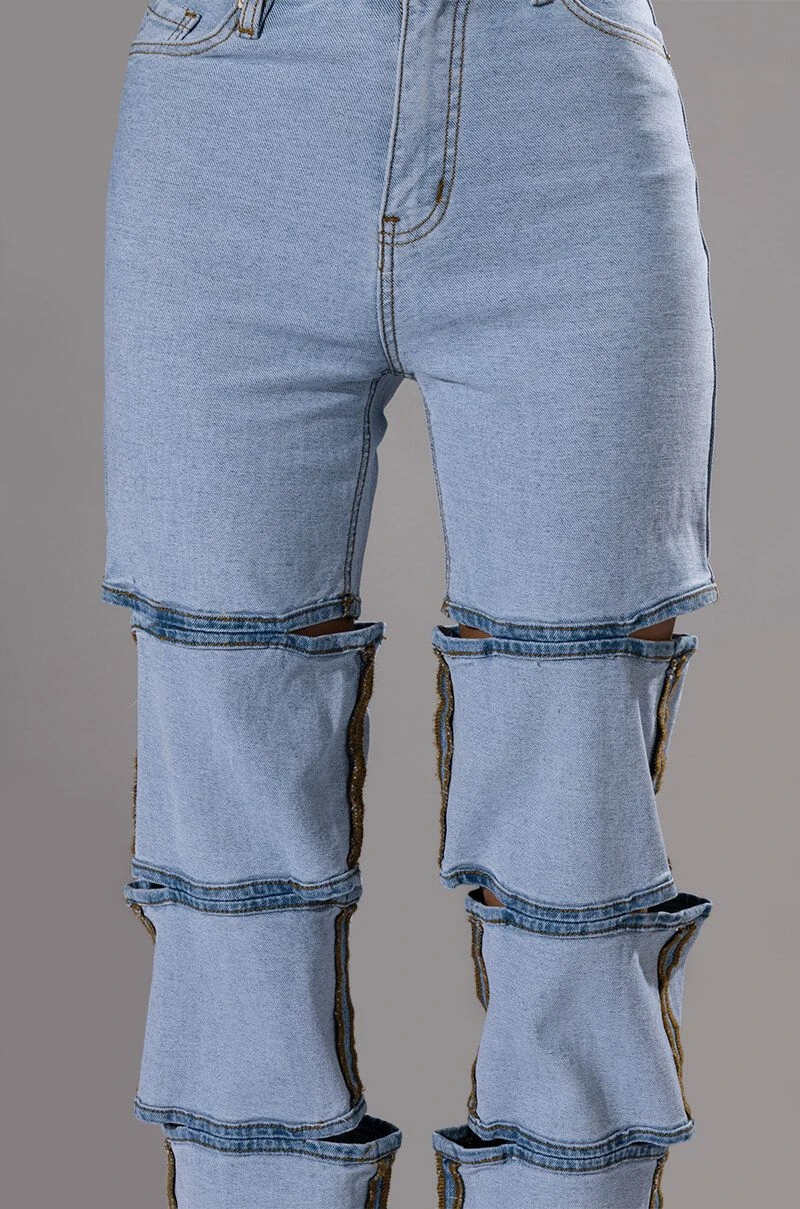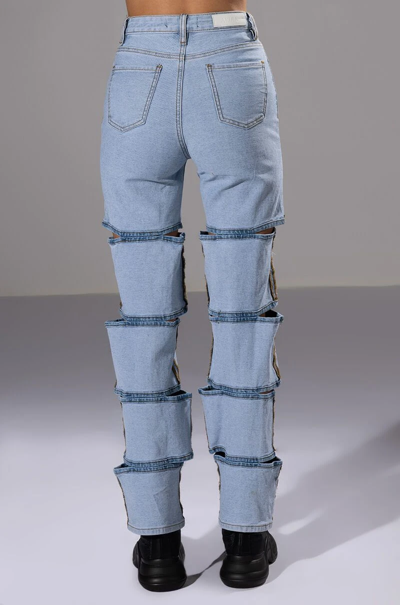 The AKIRA Label Temptation High Rise Layered Wide Leg Jean is made from a made from a washed, inside-out style denim fabrication and features a high rise waist, working belt loops, a classic five-pocket design, layered denim leg paneling with side cutouts, and a wide leg silhouette. Complete with a button and zipper front closure.