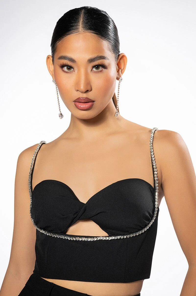 The AKIRA Label Tgif Twist Bralette Top features a smooth fabrication, adjustable spaghetti straps, rhinestone link accents, a twist front sweetheart neckline, padded bust cups, cut out underbust detailing, and a cropped silhouette. Complete with a boned bodice, inner elastic trim for a secure fit, and an exposed back zipper closure. Pair with the coordinating AKIRA Label Tgif Flare Shorts for a complete look!