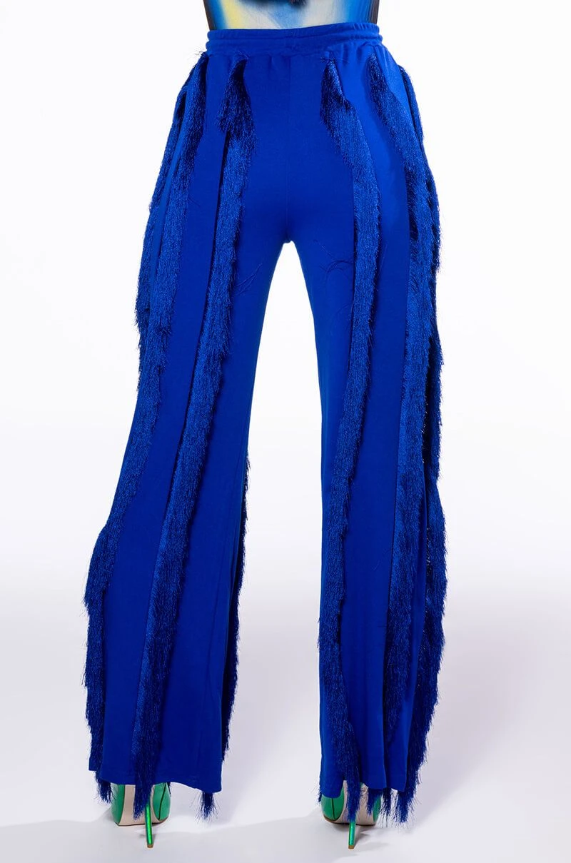 The AKIRA Label The Way You Move Fringe Pant is made from a slick jogger fabrication and features a high rise waist with a wide elastic drawstring waistband, fringe column detailing, and a straight leg silhouette.