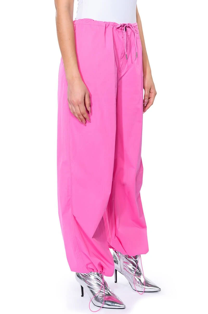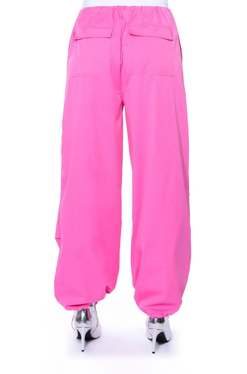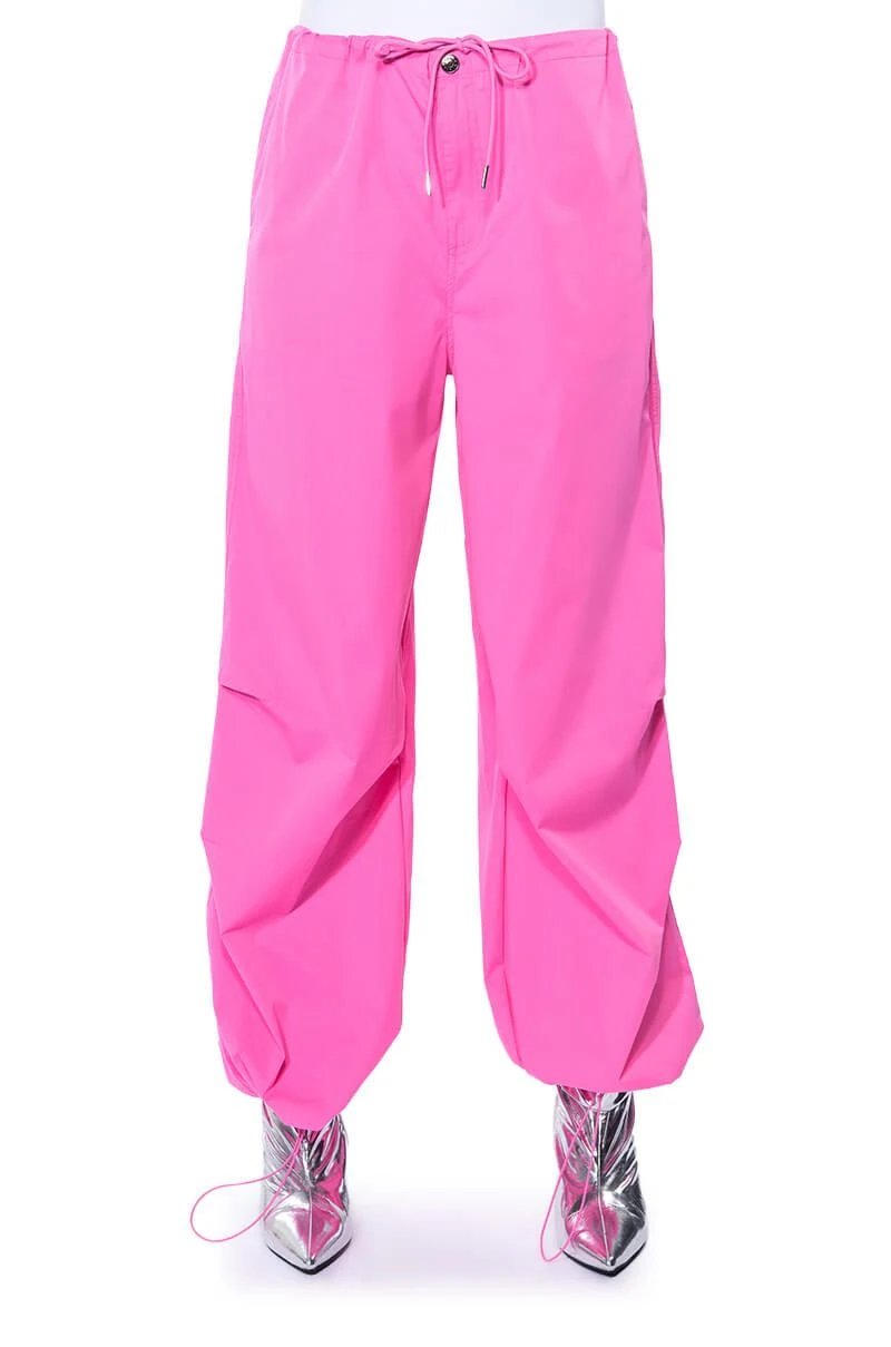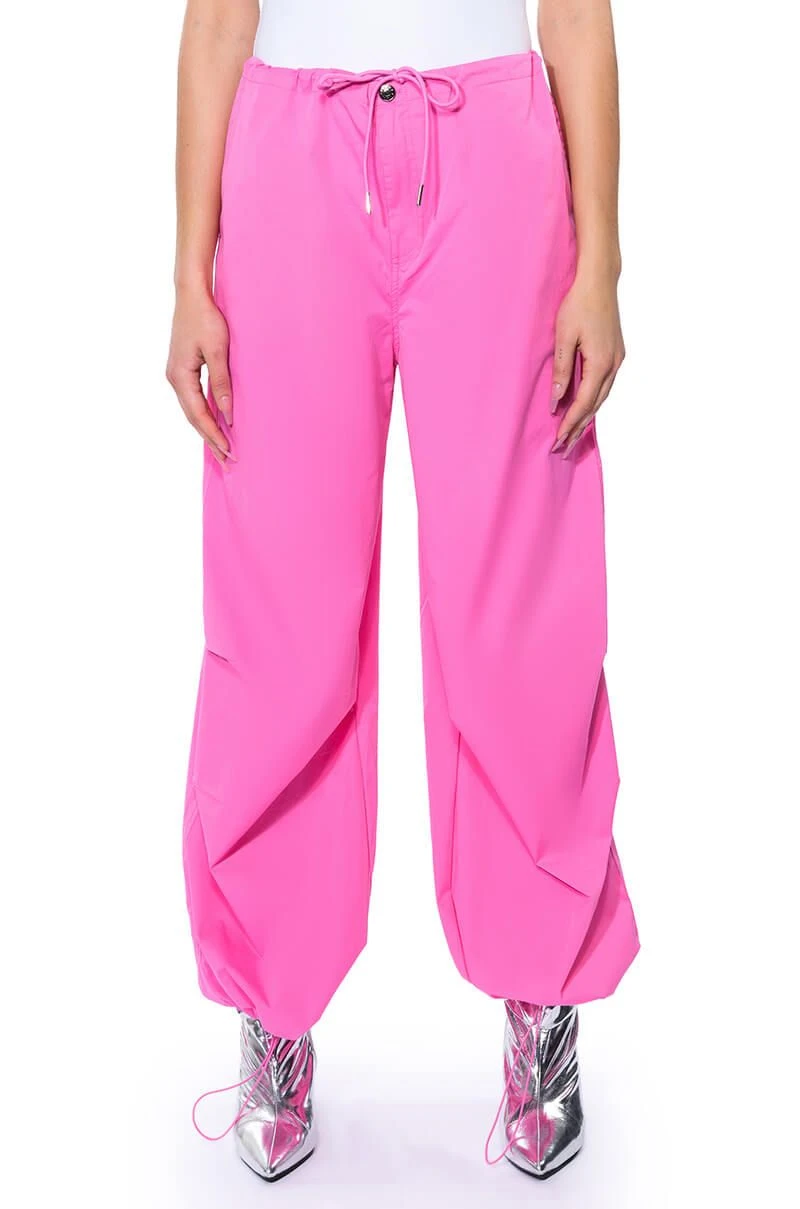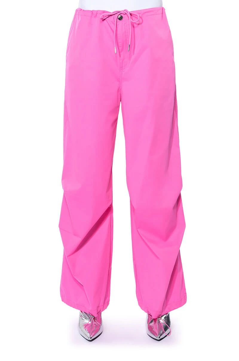 The AKIRA Label Time To Relax Wide Leg Drawstring Pants are made from a lightweight, cotton blend base fabrication and features a zippered button front closure with a drawstring waistband, a relaxed fit, oversized silhouette, and side pockets. Complete with flap pockets at the back, a wide leg and adjustable drawstrings at the bottom hems for a parachute pant look. Style with a long sleeve bodysuit and chunky boots for the finished cool-girl fantasy.