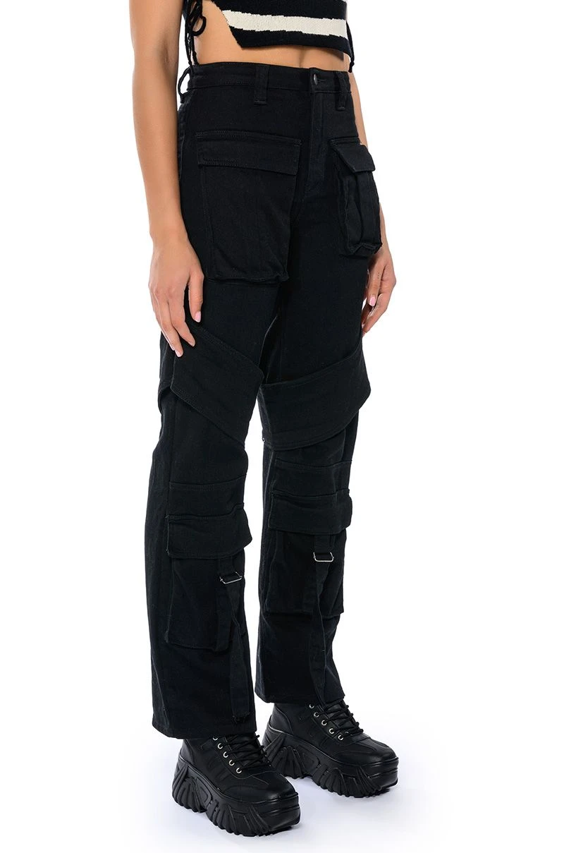 The AKIRA Label Too Cool Cargo High Waisted Jeans are a 2023 denim essential. Made with a structured cotton blend fabrication, these cargo pants feature a high-waisted, wide-leg design, deep front cargo flap pockets, and buckled cargo flap pockets at the bottom hems. Complete with wide utility bands around the thighs, back flap pockets, and a classic zip-up button closure. Pair with a long sleeve turtleneck and chunky platform boots for a sleek look.
