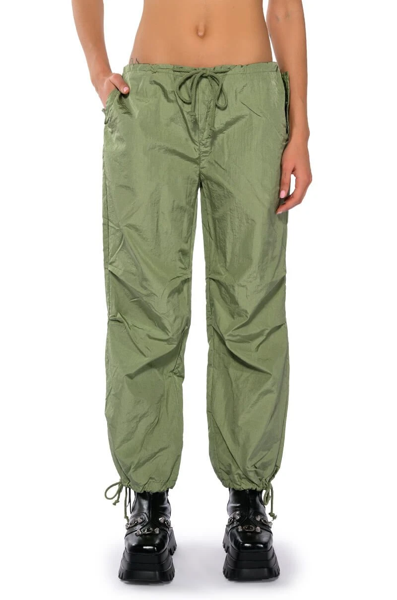 The AKIRA Label Too Legit Wide Leg Cargo Pant in Green is a lightweight parachute pant featuring a windbreaker-inspired fabrication, a high rise waist, button flap slant side pockets, and a drawstring waistline. Complete with tonal drawstring hems detailing.