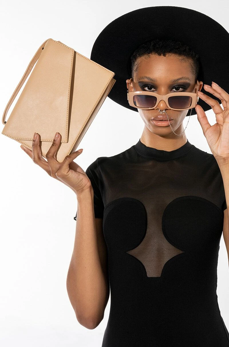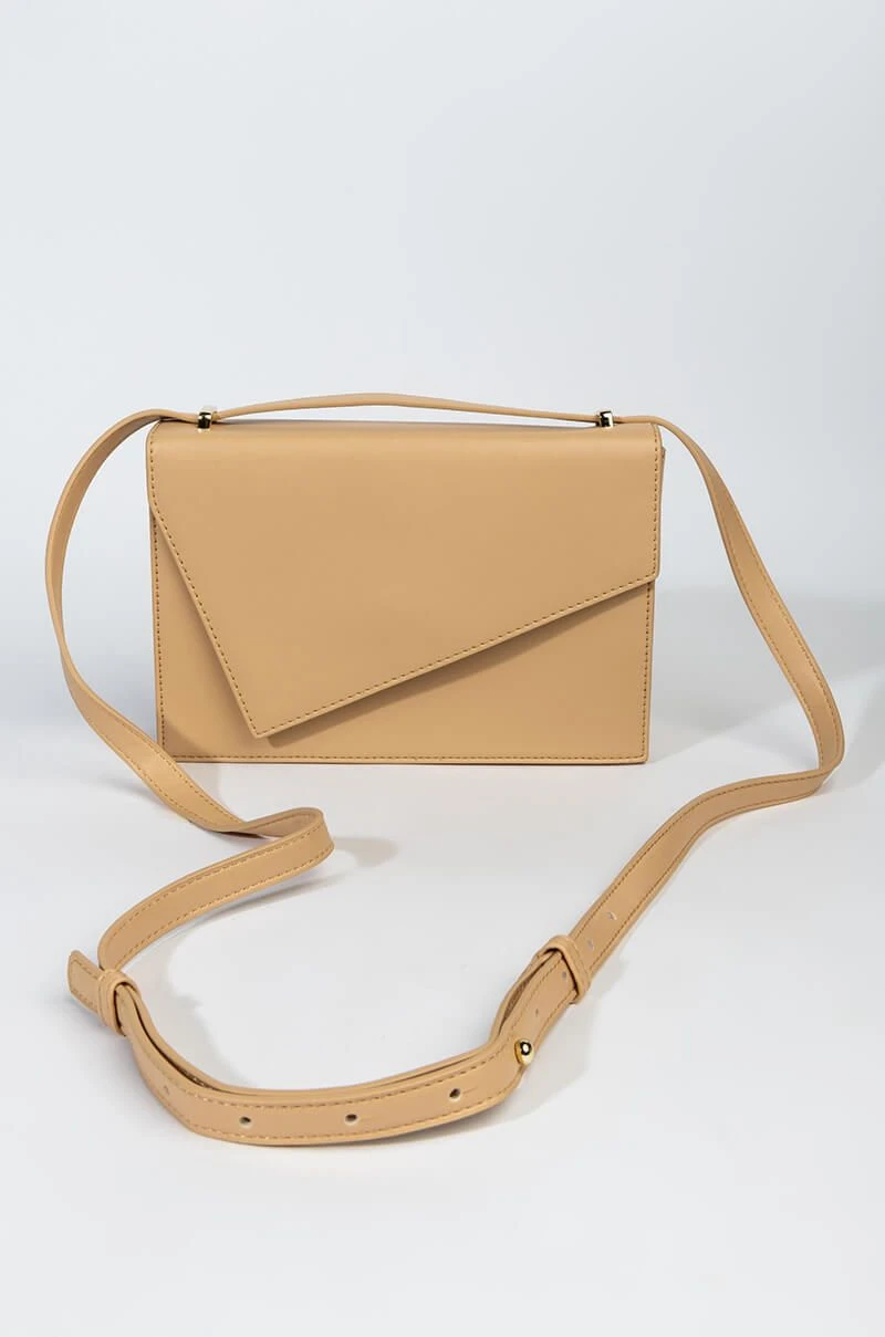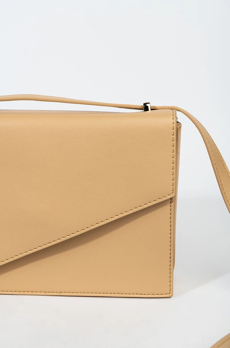 The AKIRA Label Ultimatum Beige Purse is a faux leather box bag featuring an adjustable top handle strap, faux gold metal accents, an asymmetrical front flap, a structured silhouette, inner pocket, and a push lock closure.