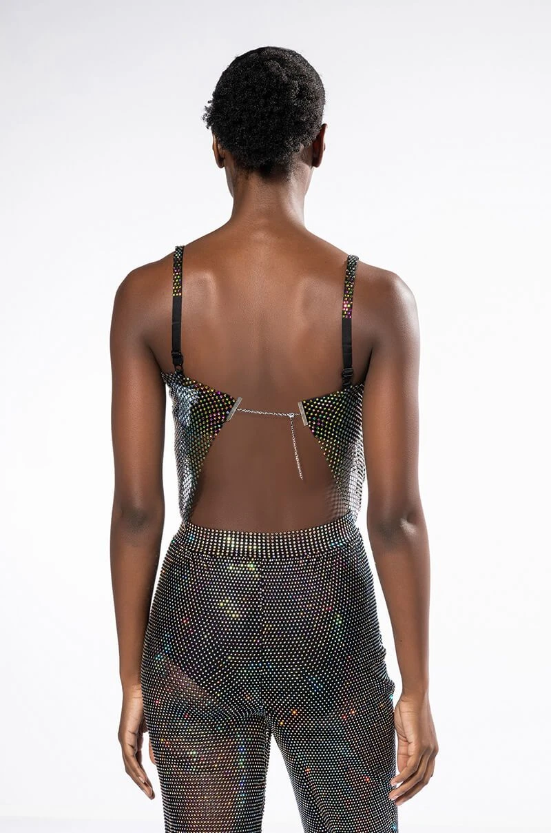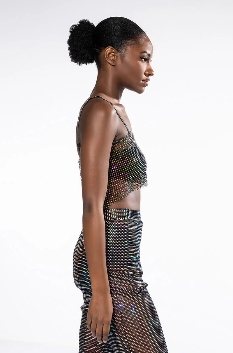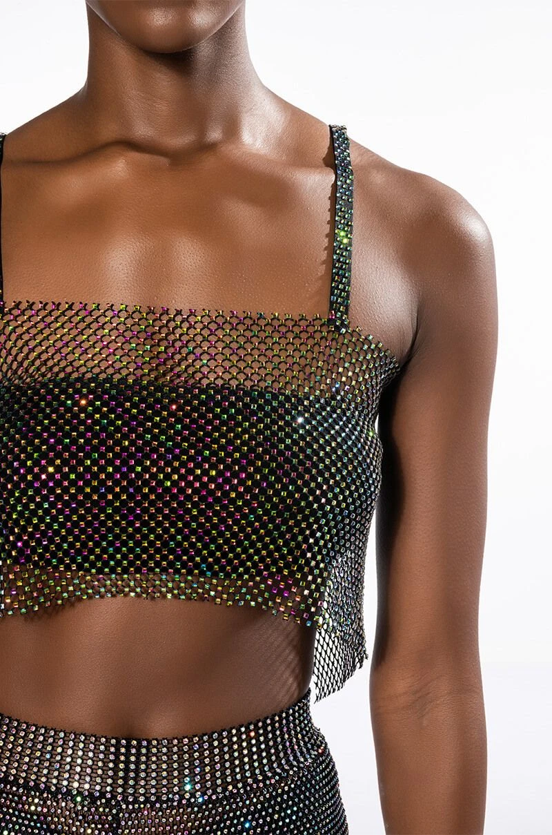 The AKIRA Label Vanessa Rhinestone Mesh Bralette is made from a sheer netted mesh base and features iridescent square rhinestone detailing, a square neckline, adjustable tank straps, an open back, and a cropped silhouette. Complete with an adjustable lobster claw chain link closure.