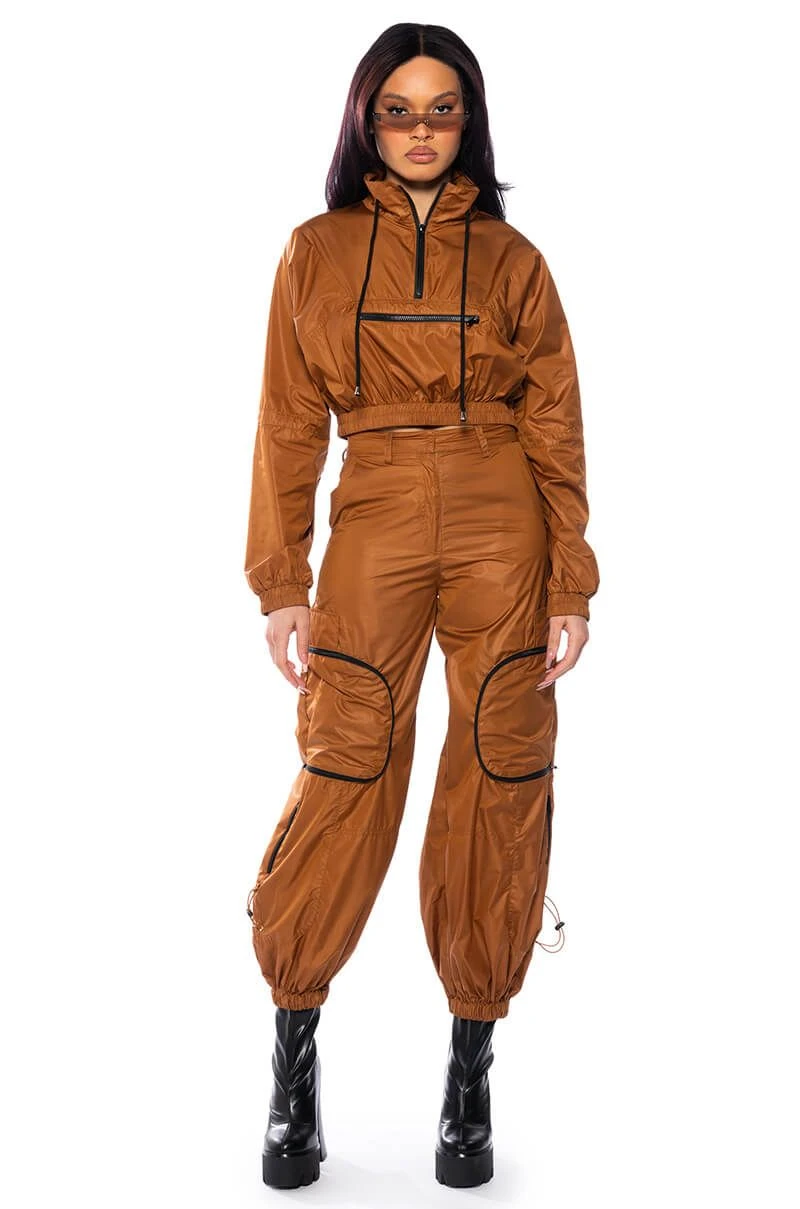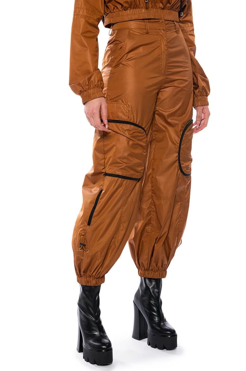 The AKIRA Label Wishful Thinking Lightweight Cargo Pant is made from a slick, lightweight fabrication and features a high rise waist, belt loops, slant pockets, zipper cargo side pockets, back pockets, toggle drawstring detailing, a slouchy silhouette, ruched elastic ankle hems, and a front bar and zipper closure. Pair this piece with the matching AKIRA Label Wishful Thinking Quarter Zip Pullover and chunky sneakers to complete your fresh athleisure look.