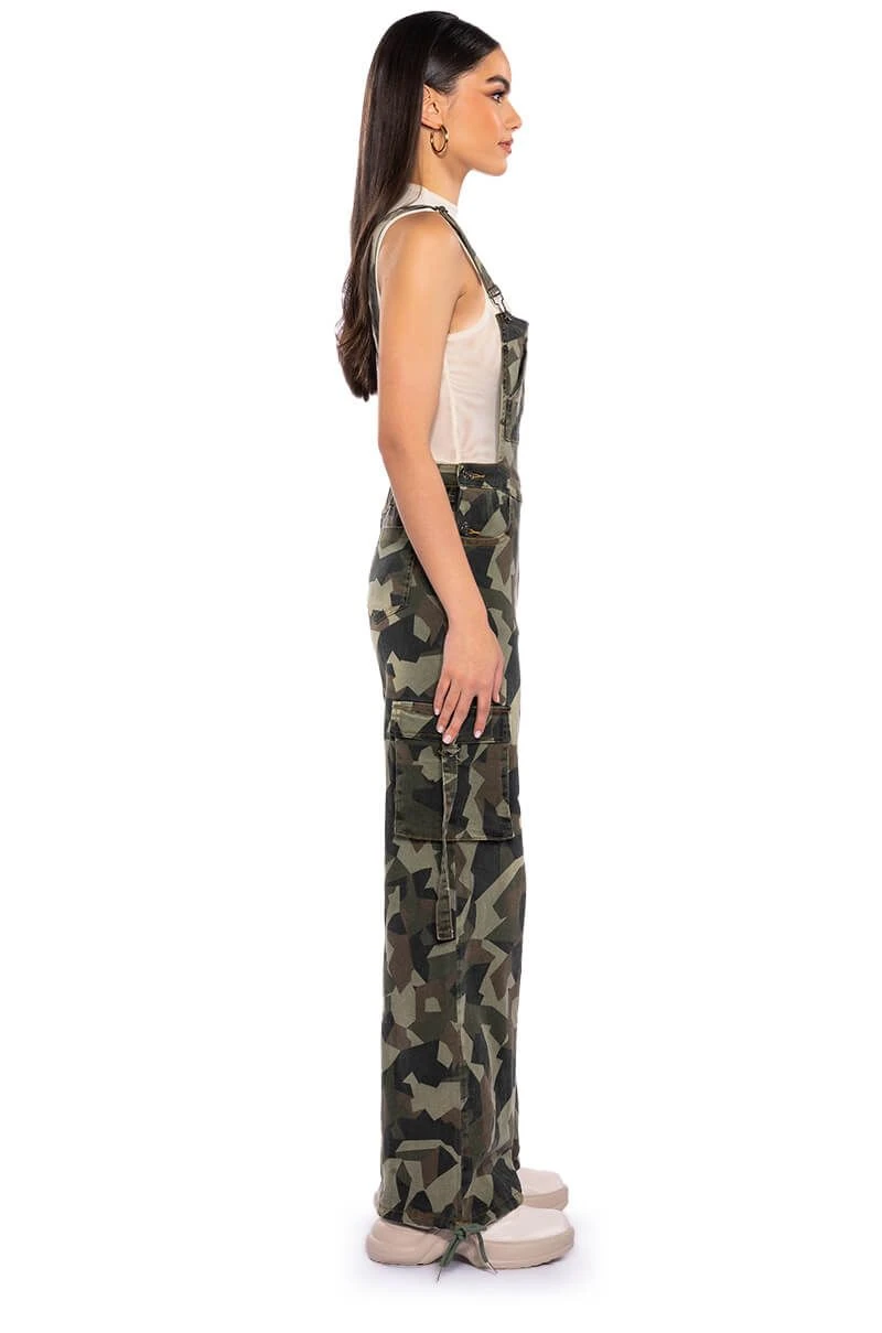 The Work For You Adjustable Overalls feature a denim-inspired camo print fabrication, a classic pinafore design, adjustable buckled bib straps, a large bib pocket, button sides, slant side pockets, and working back pockets. Complete with a mock front zipper, cargo thigh pockets, and adjustable drawstring ankle hems.