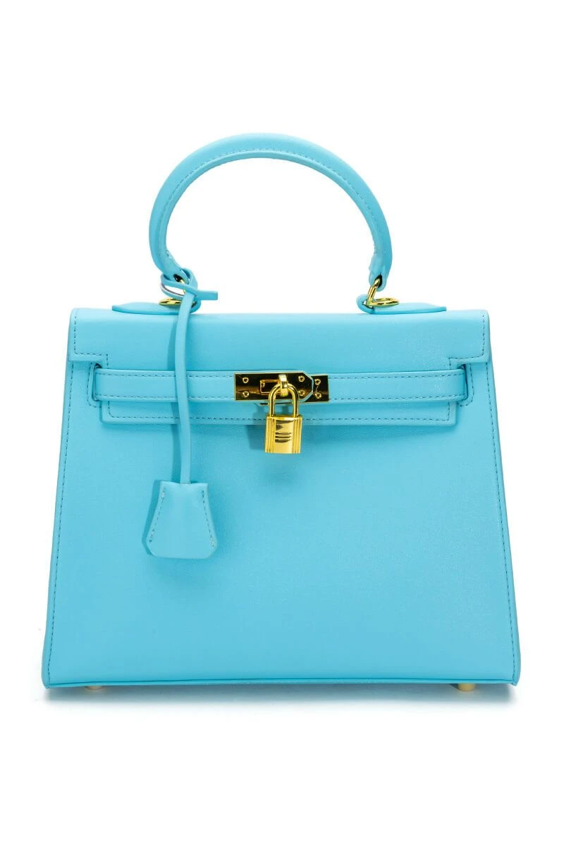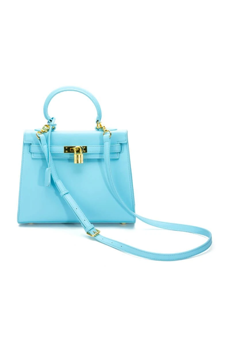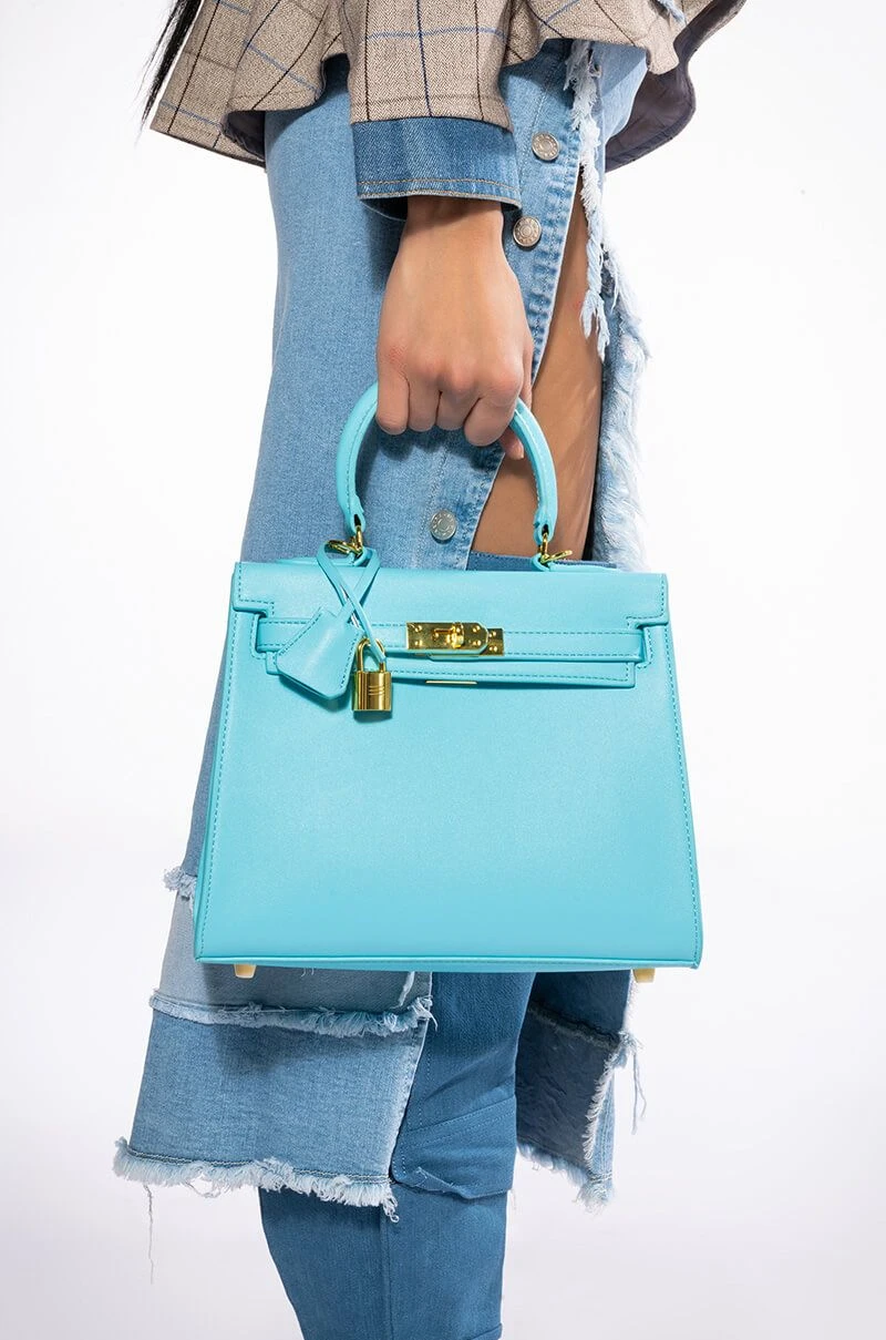 Make it work! You’re the boss with The AKIRA Label Work It PU Leather Light Blue Bag. This ladylike top handle bag features a structured faux leather fabrication, a removable shoulder strap, faux gold hardware, and a turn lock front closure. Complete with a hidden key in the clochette pouch..