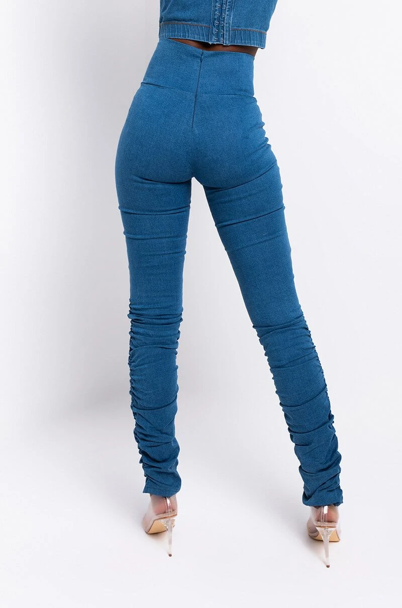 You know you love us! The AKIRA LABEL X.O. High Rise Stacked Denim comes in a medium blue denim wash, and features ruched legs, high rise waist, and a hidden back zipper. Style these jeans with your favorite sweater and a pair of stiletto booties for a comfy chic look!